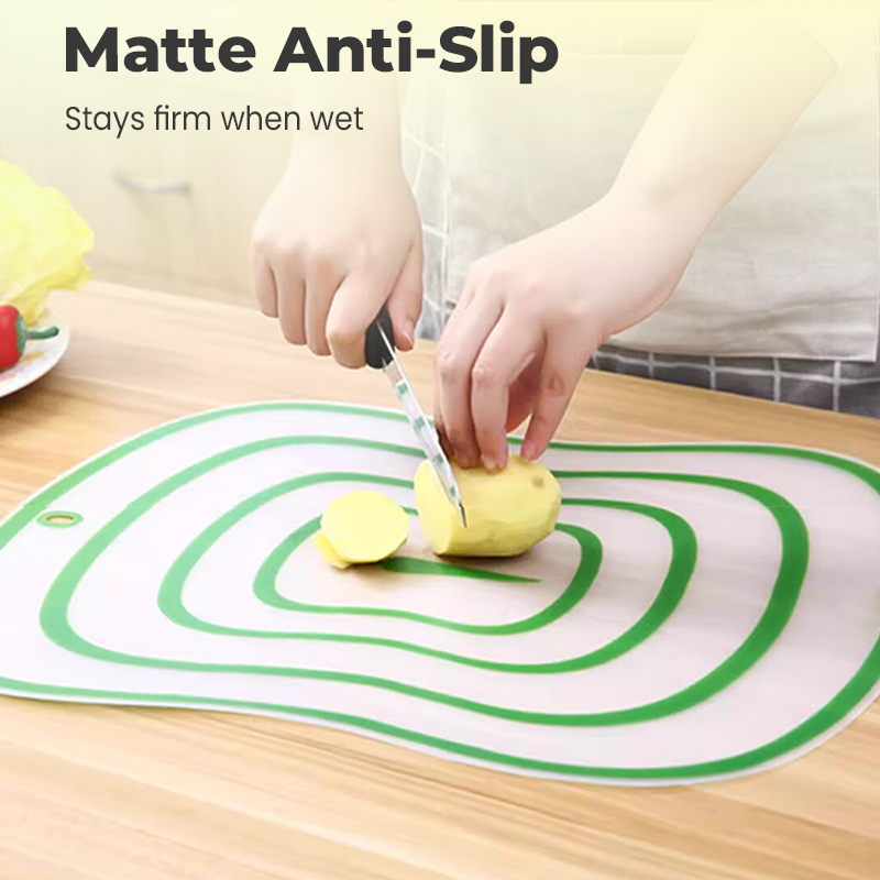 АНТИПЪЛЗГАВА МАТОВА ПОВЪРХНОСТ, СТАБИЛНА И СИГУРНА: Текстурираното матово покритие подобрява сцеплението и предотвратява плъзгането по време на употреба. Дори когато е мокра, дъската остава стабилно на мястото си върху плотовете, което намалява риска от инциденти и позволява по-безопасно и прецизно рязане, особено с остри ножове.
