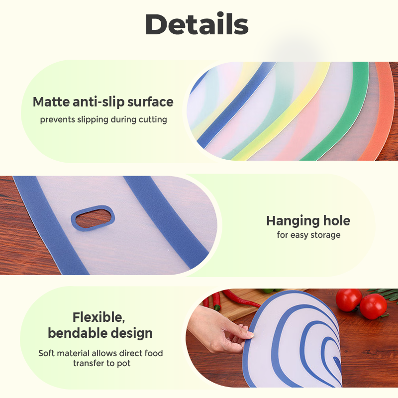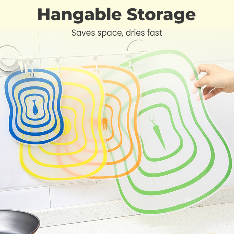 ЦВЕТОВО КОДИРАНЕ ЗА РАЗДЕЛЯНЕ НА ХРАНИТЕ: Налични в различни цветове и размери, всяка дъска може да бъде предназначена за определен вид храна – месо, риба, плодове или зеленчуци. Тази интелигентна категоризация помага да се предотврати кръстосаното замърсяване и прехвърлянето на аромати, като се запазва свежестта и целостта на храната.