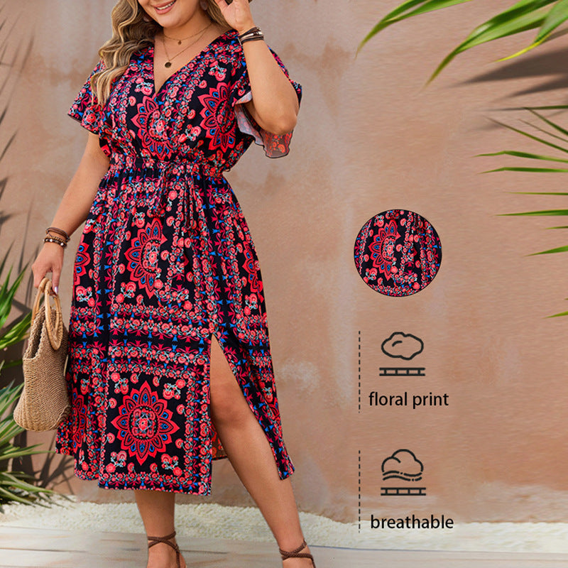1 * Дамска ежедневна рокля с V-образно деколте и ретро принт