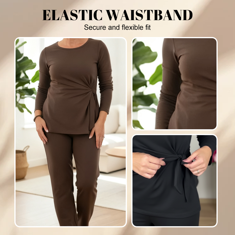 ДЕКОРАТИВНИ ВЪРЗИ ОТСТРАНИ – Две фини връзки отстрани придават стилен визуален акцент, като подчертават талията, без да ограничават комфорта. Те създават минималистичен, но моден детайл, придаващ на облеклото модерен и шик вид. Идеални за ежедневни излизания, отдих у дома, неформални събирания или релаксиращо облекло за уикенда.
