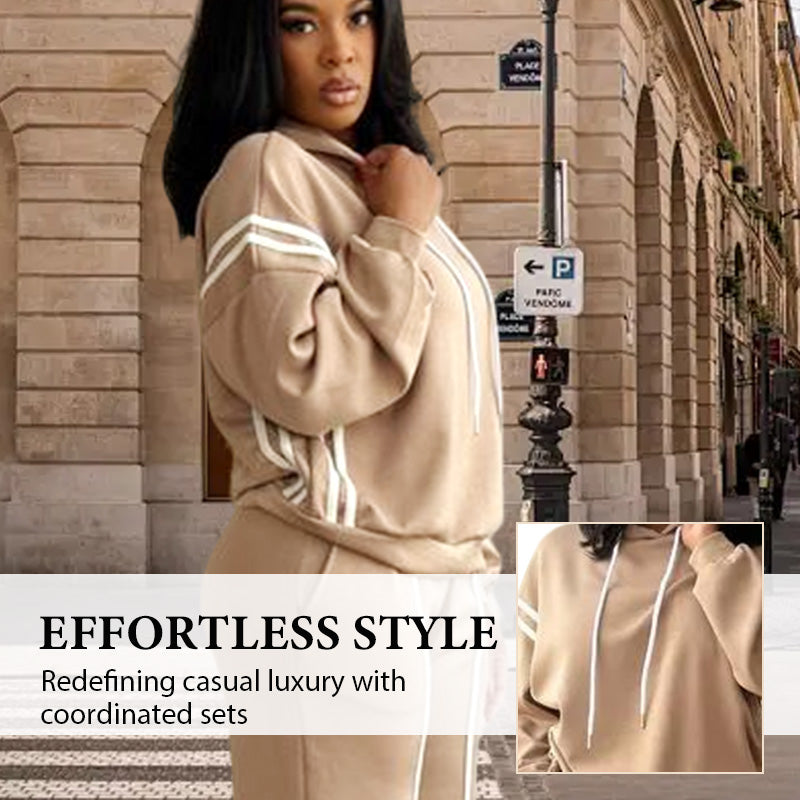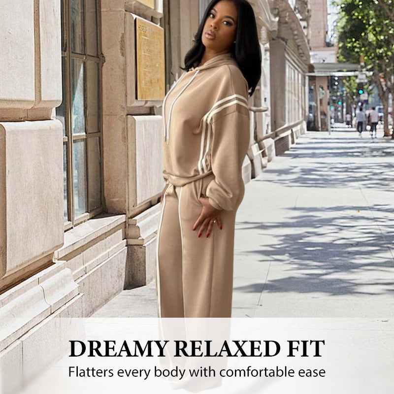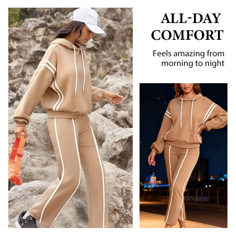 ПРОСТ СТИЛ, ПОВИШЕН КОМФОРТ – Този ексклузивен комплект от две части предефинира понятието „небрежен лукс“. Изхвърлете стария си спортен екип! Съчетаните суитшърт с качулка и панталони с широки крачоли създават елегантен, хармоничен вид, който е толкова удобен, колкото и любимите ви дрехи за дома.